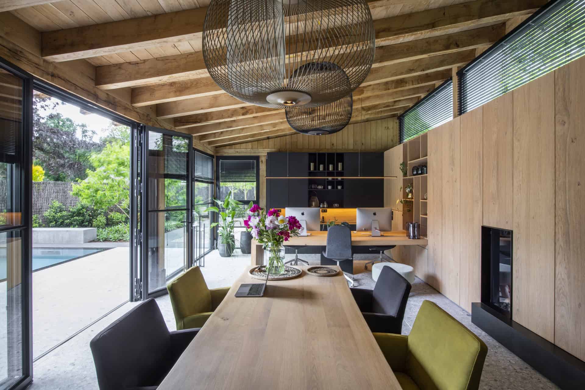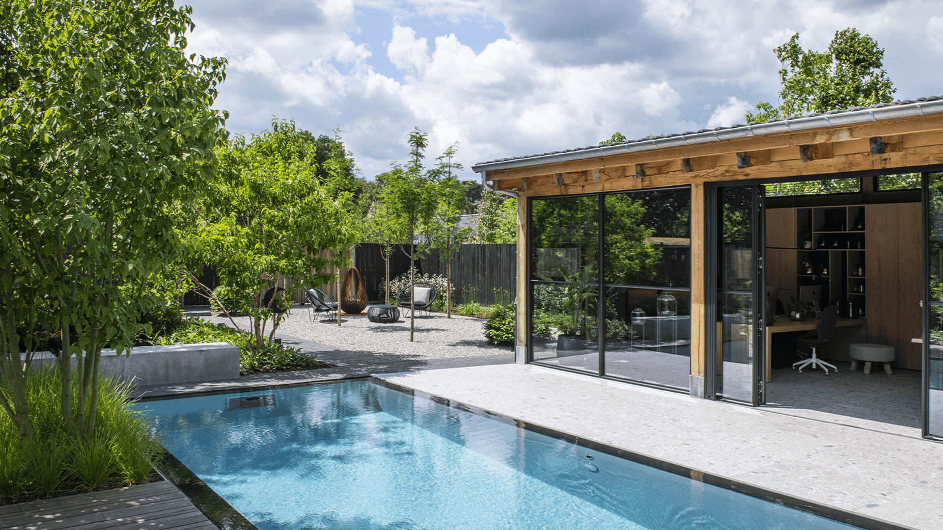 De randafwerking in zwarte gezoete graniet (Nero Assoluto) zorgt voor een krachtig, elegant contrast en sluit naadloos aan bij de architecturale lijn van het eiken bijgebouw. Materialen, kleuren en verhoudingen vloeien samen tot één coherent geheel.